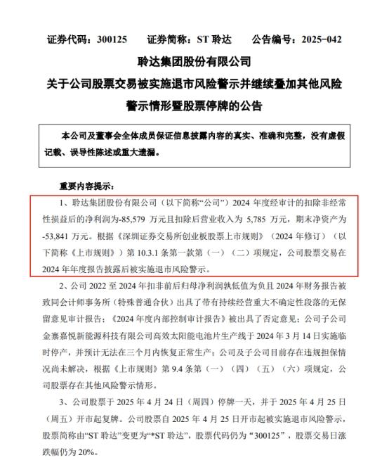 公开资料显示,*ST聆达已连续5个会计年度亏损,2024年度更是业绩雪崩,净利润亏损9.50亿元,同比下降262.42%;营收仅为0.6亿元,同比下降92.71%。