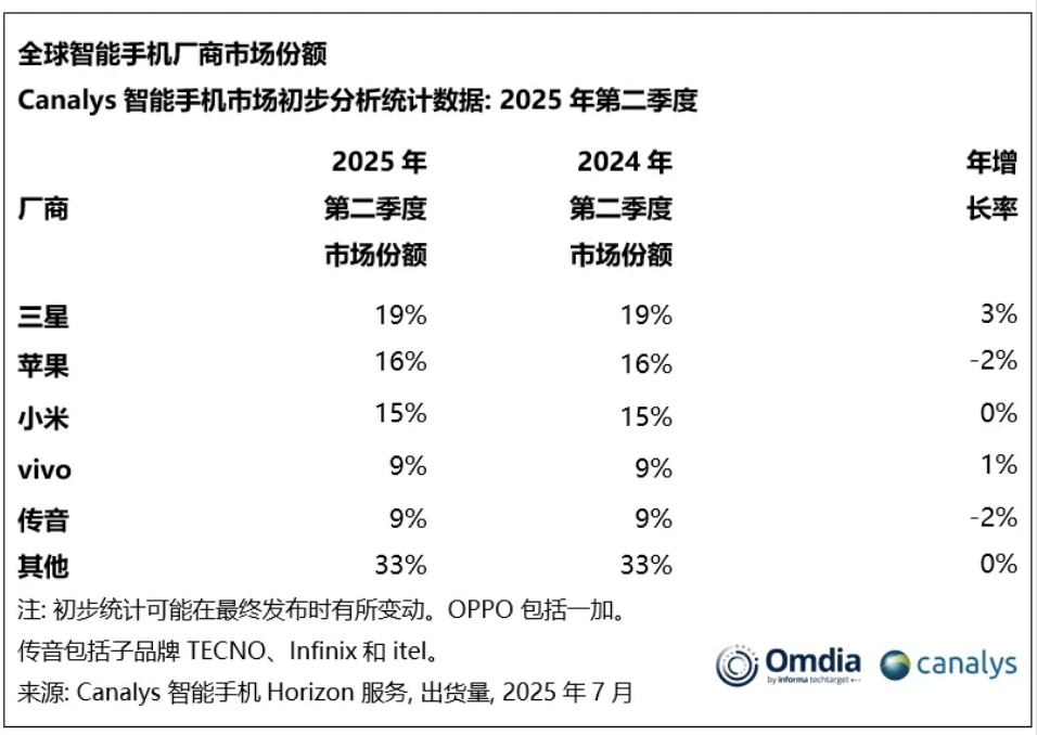 基于Canalys公布的2025年第二季度全球智能手机市场情况,vivo实现逆势增长,海外市场份额提升明显,以9%的全球市场份额位列第四,成为全球智能手机市场份额唯一正增长的中国手机品牌。