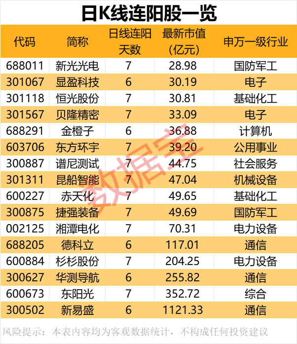 据证券时报·数据宝统计辉煌配资,截至昨日收盘,剔除ST股和北交所个股后,有16股日K线连阳天数在6天及以上。